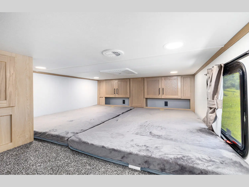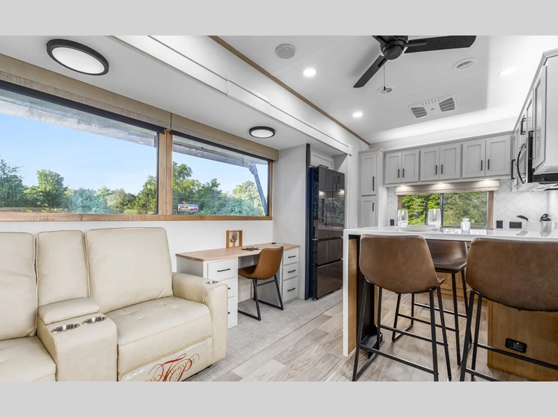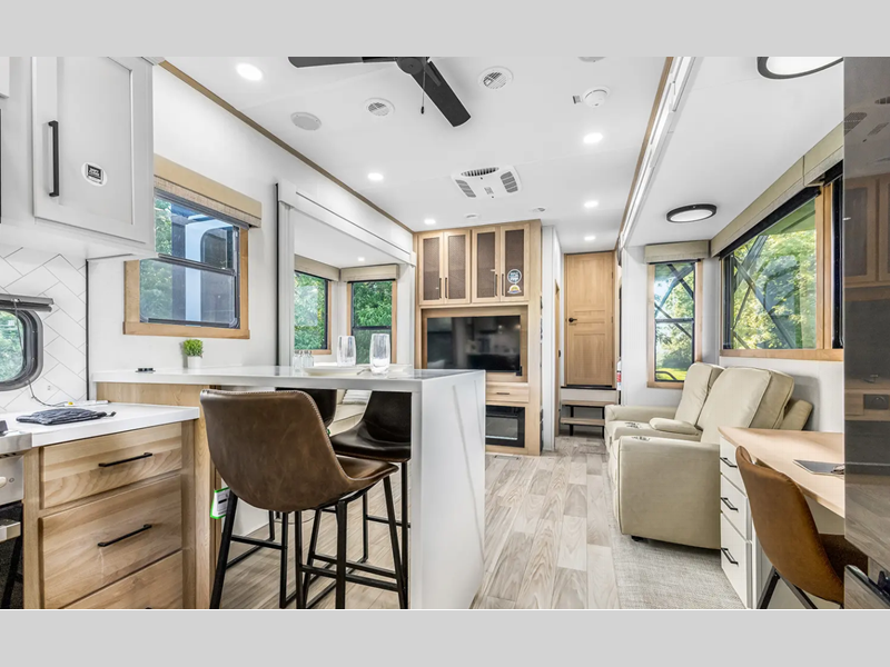 The electric leveling system included makes setting up a breeze allowing you to start having fun sooner. The underbelly armor will protect your unit's vitals from road debris and the painted two-tone aerodynamic fiberglass front cap with improved turning radius will make it easier to maneuver. You'll also enjoy Rich Solar 200W roof mounted solar panel with controller and battery, an on demand tankless water heater, two 15,000 BTU A/C units, and more amenities to make camping hassle-free. And the cook in your group will love the Chef collection 3 burner over with drawer, complete with solid surface countertops, decorative backsplash, and a spacious 12V refrigerator to name a few features.
